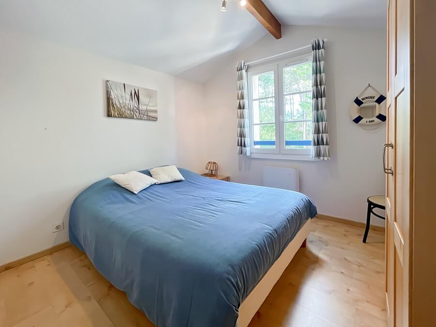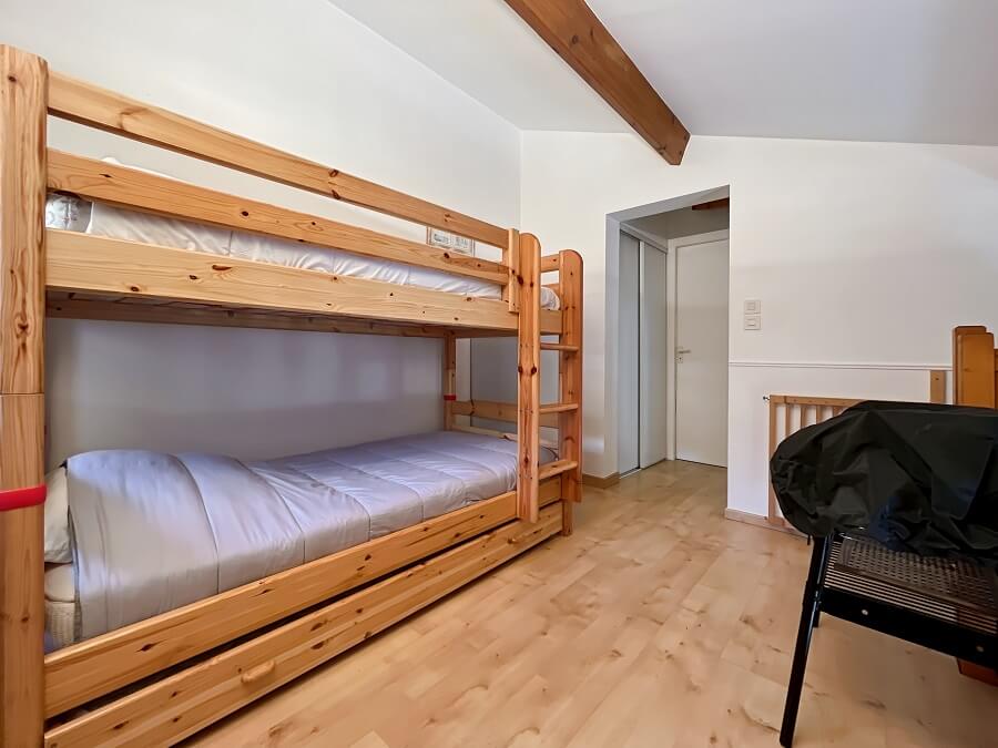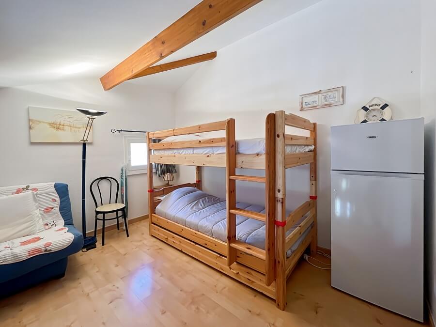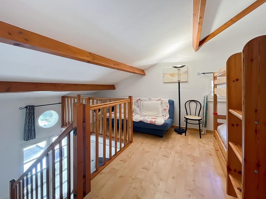 A l'étage, vous retrouverez une mezzanine avec deux lits superposés (lit de 90cm), d'une chambre avec un lit double (lit de 140cm) et d'une salle de bain avec WC séparés.