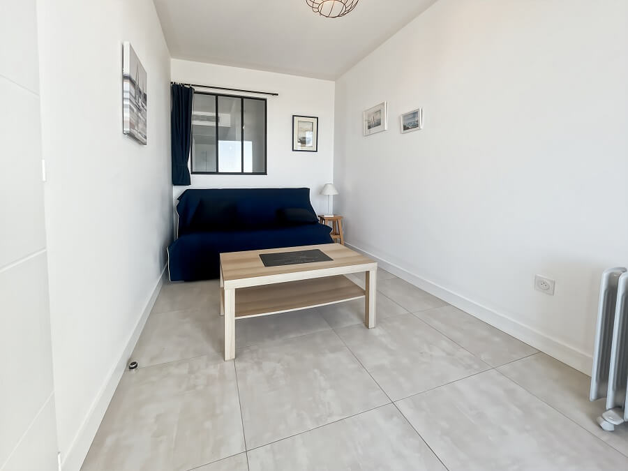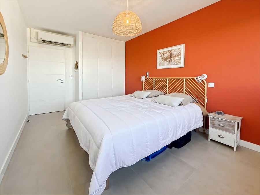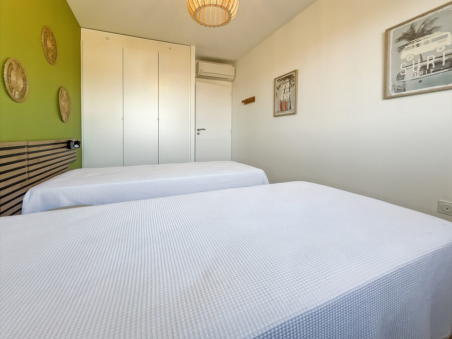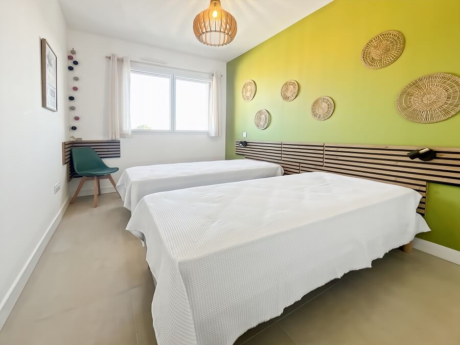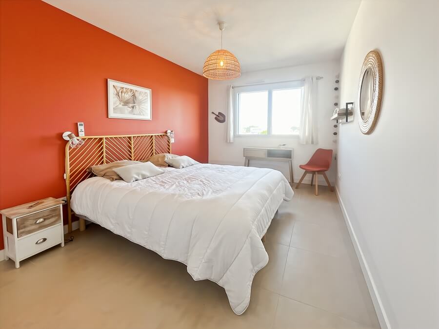 Vous retrouverez dans la première chambre un lit double de 160cm. La seconde chambre est équipée de deux lits simples de 90cm. La troisième chambre avec vue mer est composée d'un bz pour deux personnes.
