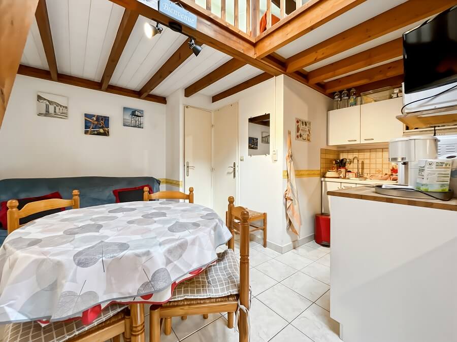 Cette maison de vacances se compose d'un séjour avec un coin cuisine, d'une chambre cabine au rez-de-chaussée avec un lit double (lit de 140), d'une mezzanine avec deux lits simples (lits de 90) et d'une salle d'eau avec WC séparés.
