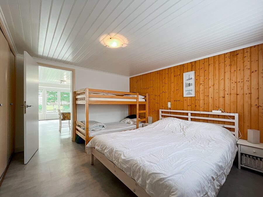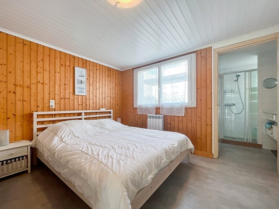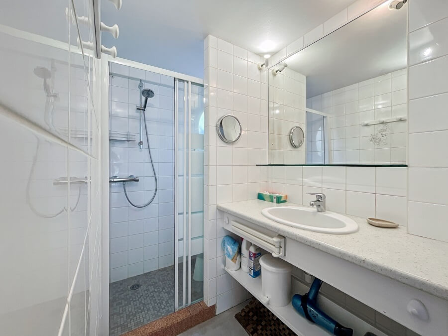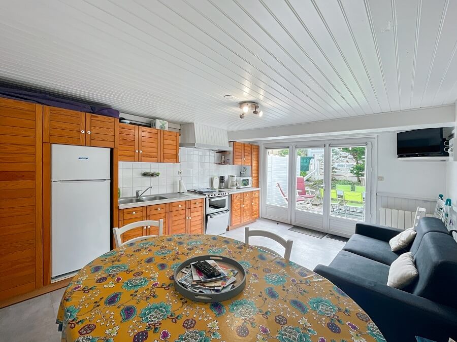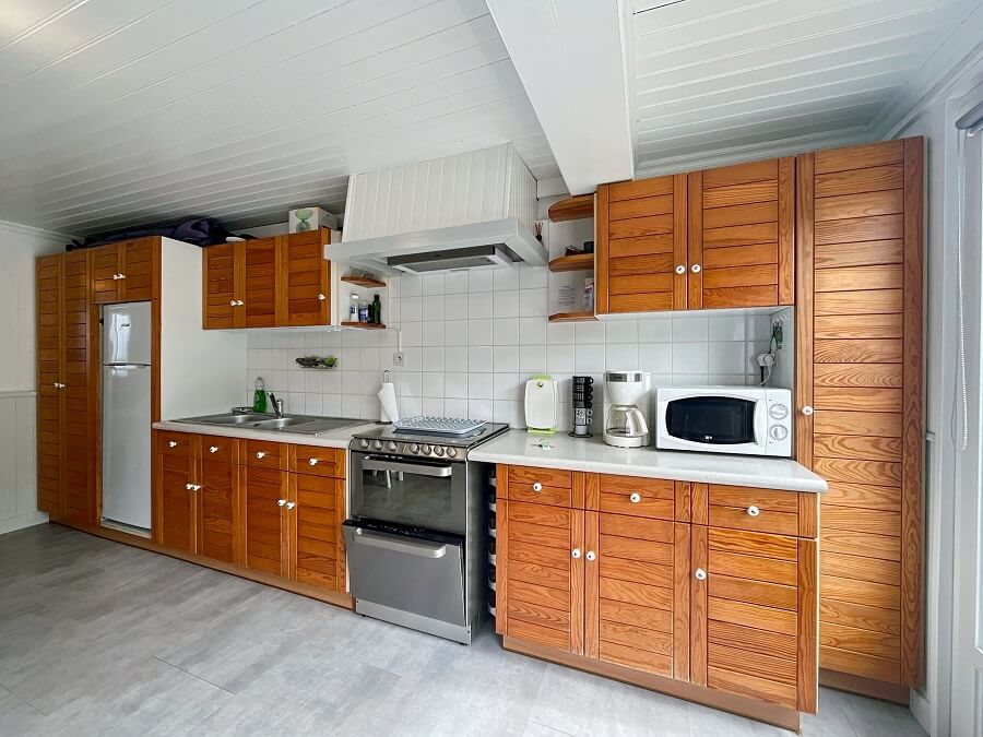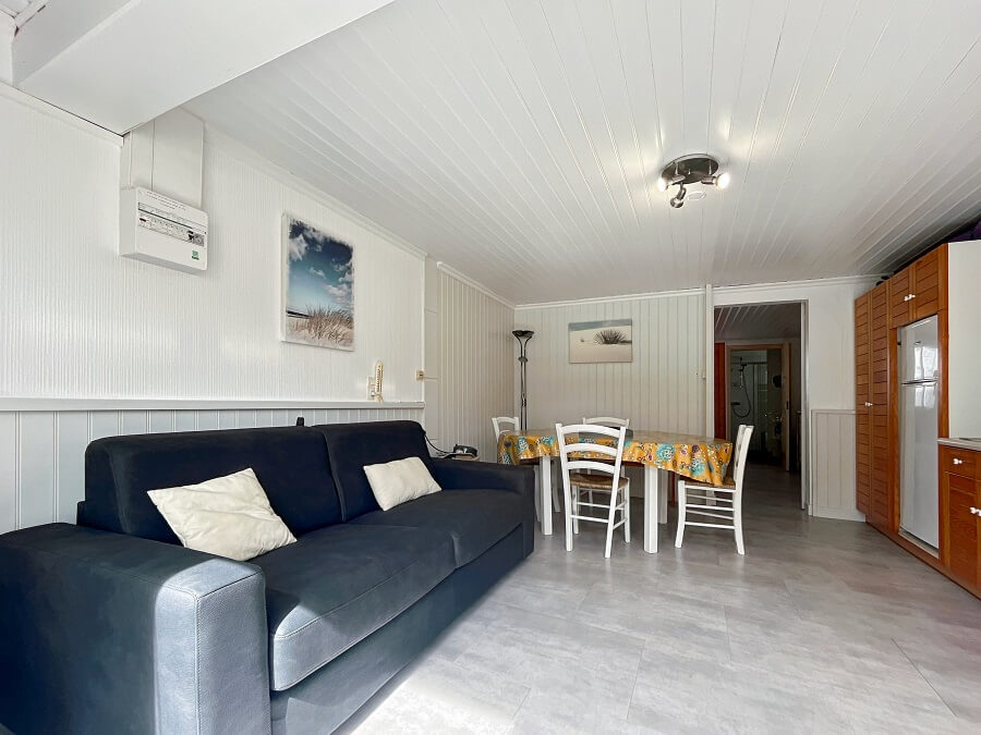 Cet appartement à louer se compose d'un séjour avec cuisine (convertible pour couchage deux personnes), d'une chambre avec un grand lit double (lit de 160) et des lits superposés (lits de 80), et d'une salle d'eau (douche avec WC dans le même espace).