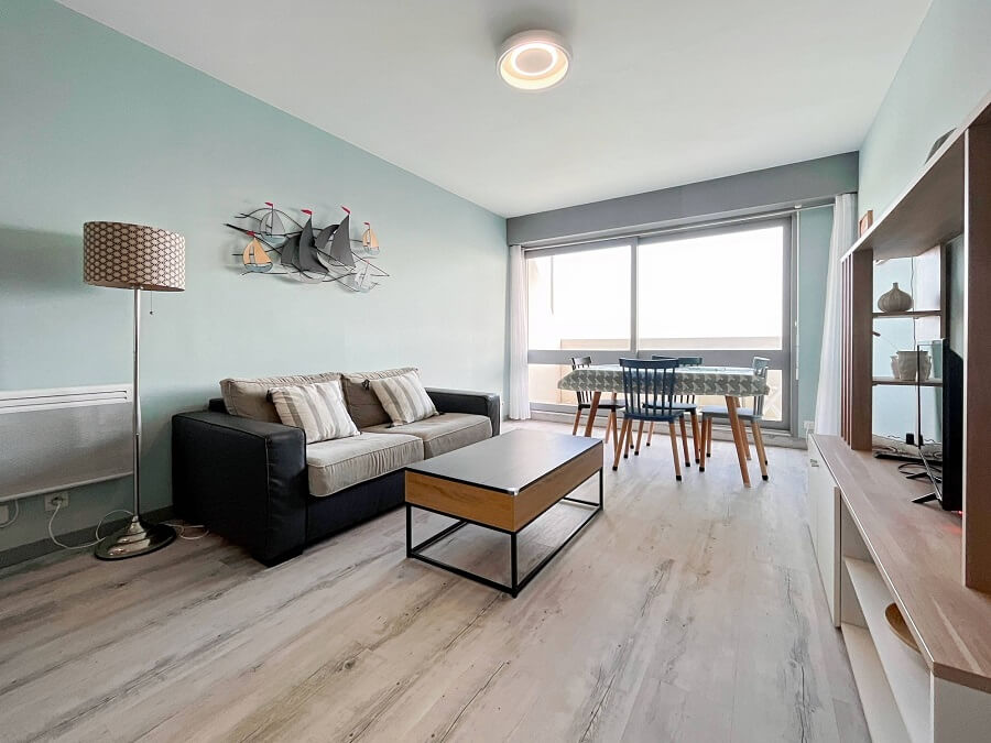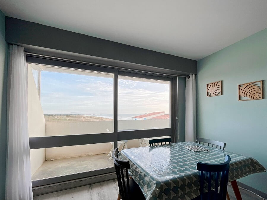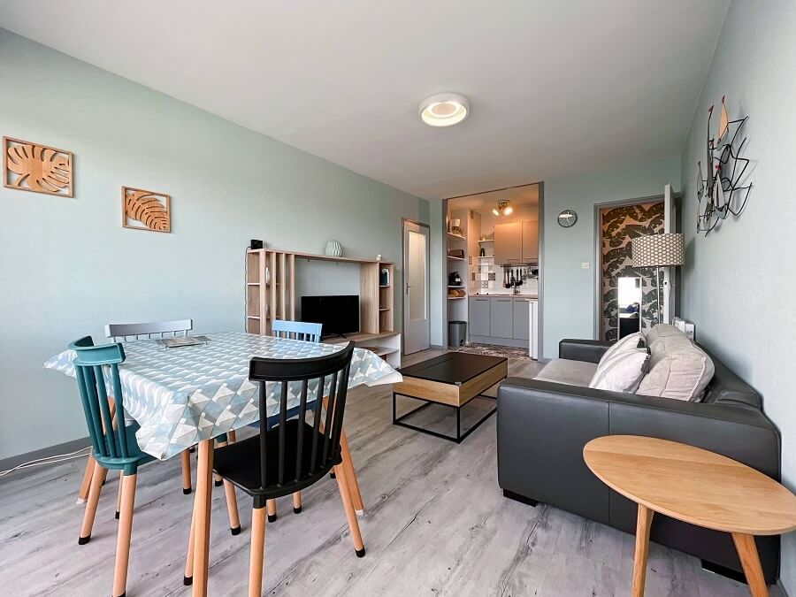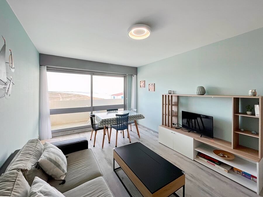 Cet appartement proche de la mer est idéal pour passer des vacances en toute tranquillité. Situé proche des commerces, cet hébergement saisonnier dispose d'un séjour donnant sur le balcon avec un canapé convertible, d'une cuisine ouverte, ainsi que d'une salle de bain avec WC séparés.