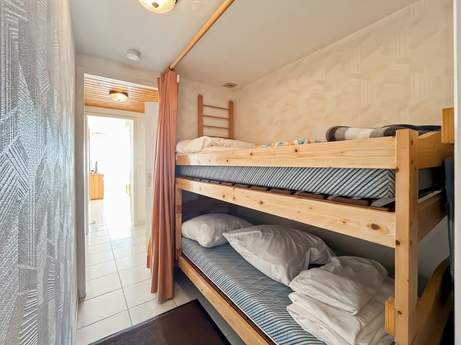 Elle dispose d'une chambre donnant sur l'arrière avec un lit de 140 &. d'une alcôve (dans le couloir) avec des lits superposés.