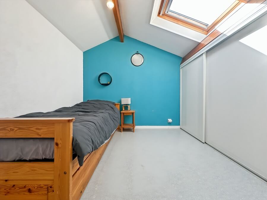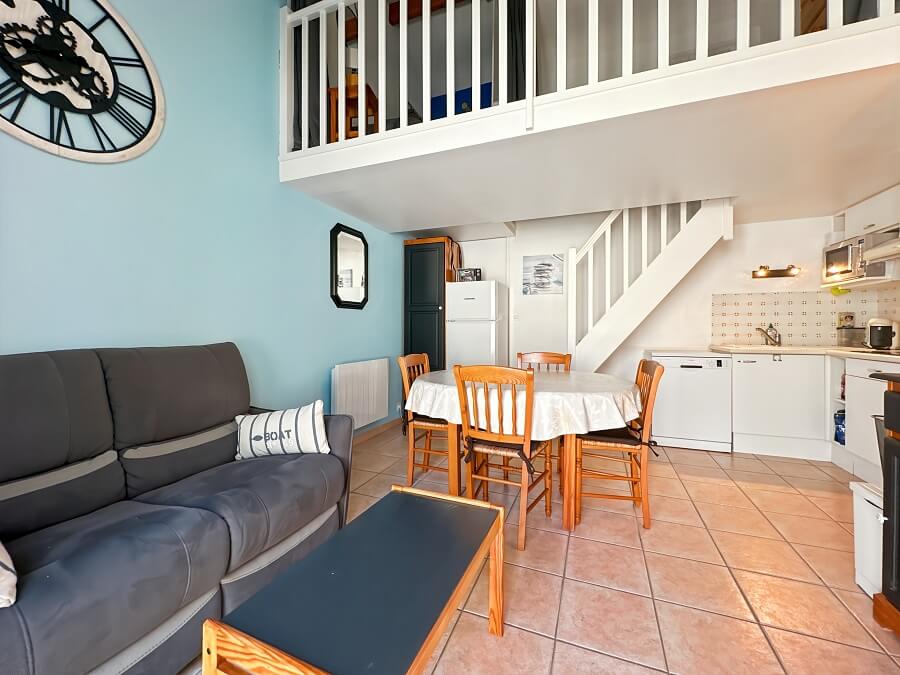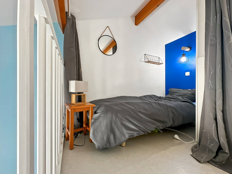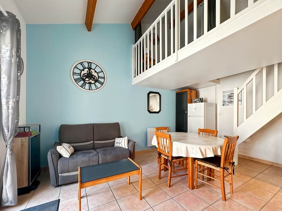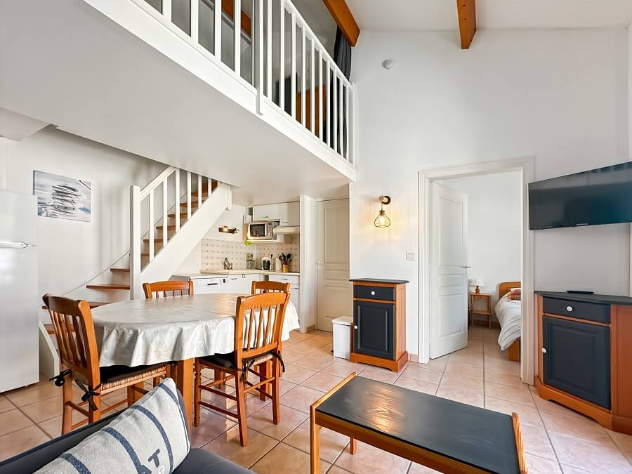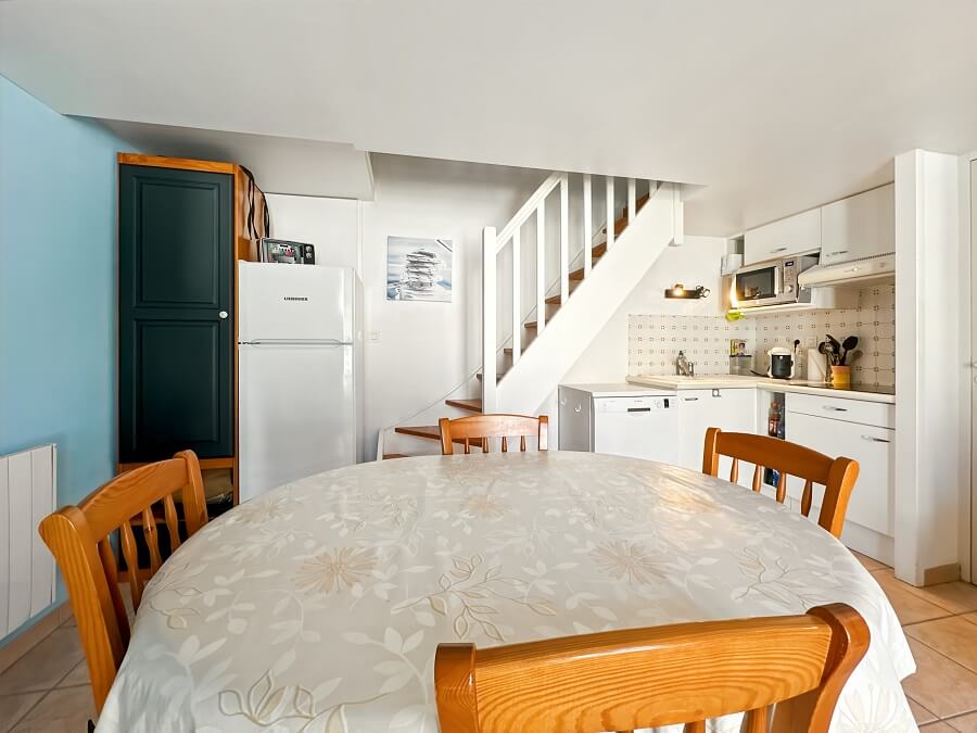 Cette maison de vacances se compose d'un séjour avec cuisine, d'une chambre parentale au rez-de-chaussée (lit de 140), d'une chambre fermée à l'étage avec deux lits gigognes (lits de 80) accompagnés d'un troisième lit simple (lit de 80) sur la mezzanine, d'une salle d'eau avec WC séparés.
