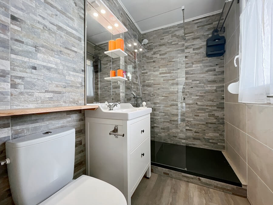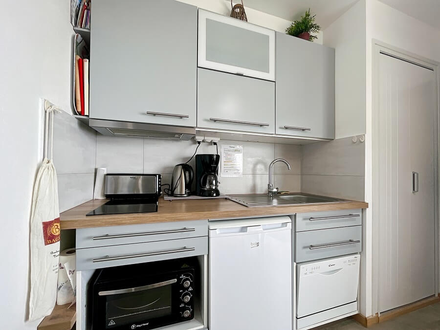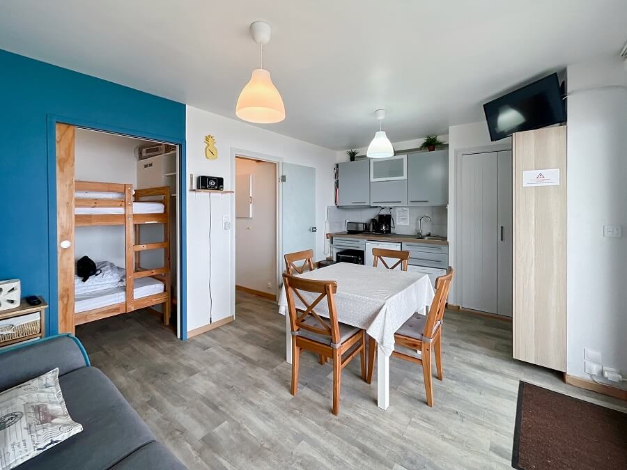 Ce très joli studio entièrement rénové avec un balcon face mer donnant sur l'esplanade de la mer se compose d'un séjour/cuisine avec un canapé lit, d'une chambre alcôve avec lits superposés (lits de 90) et d'une salle d'eau avec WC.