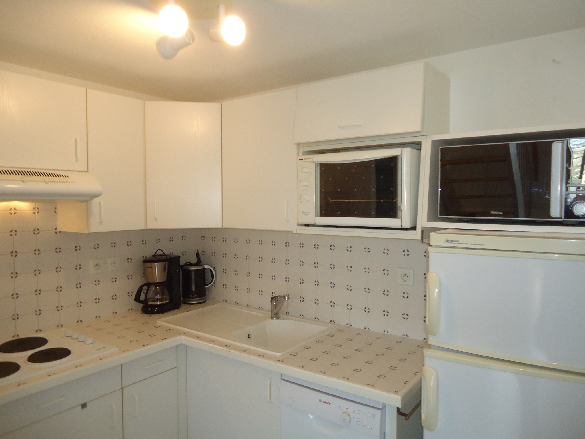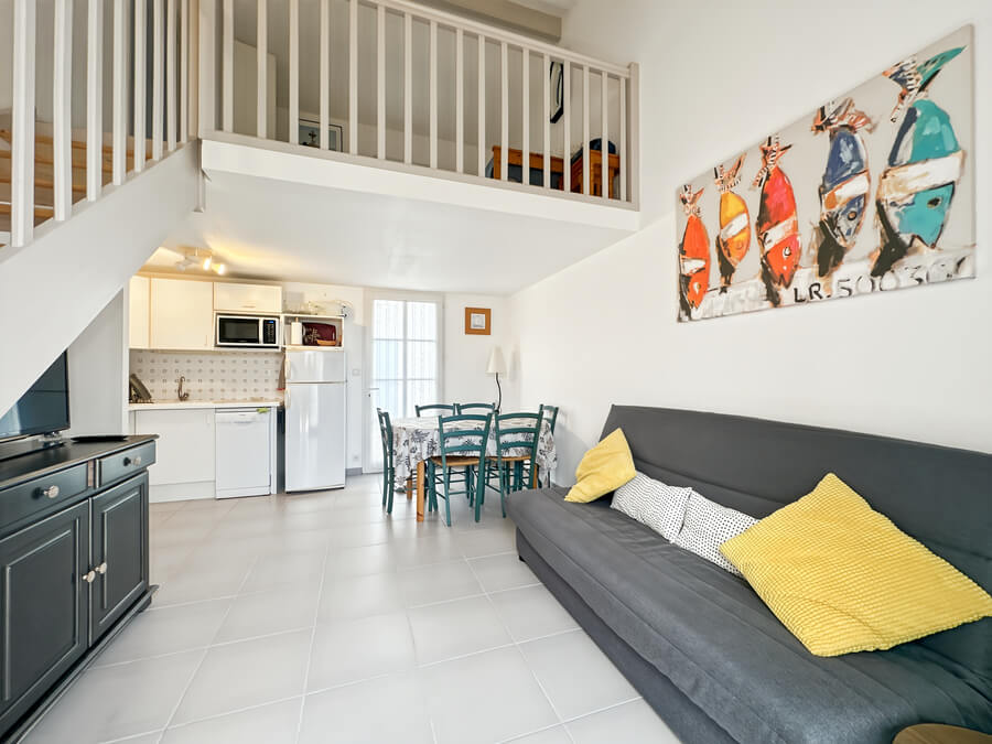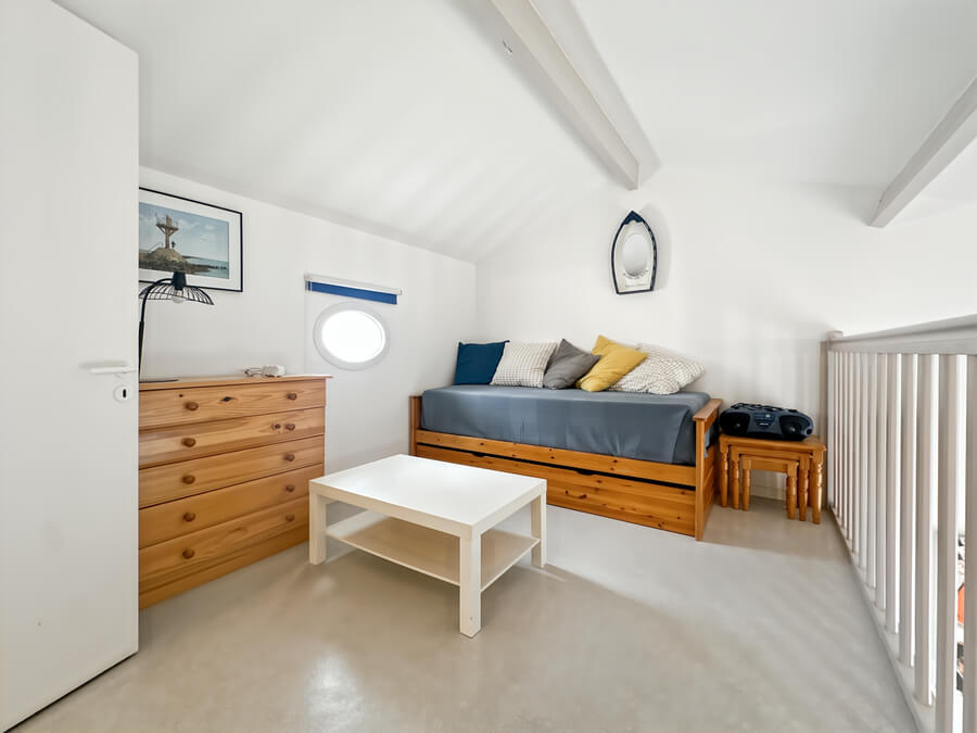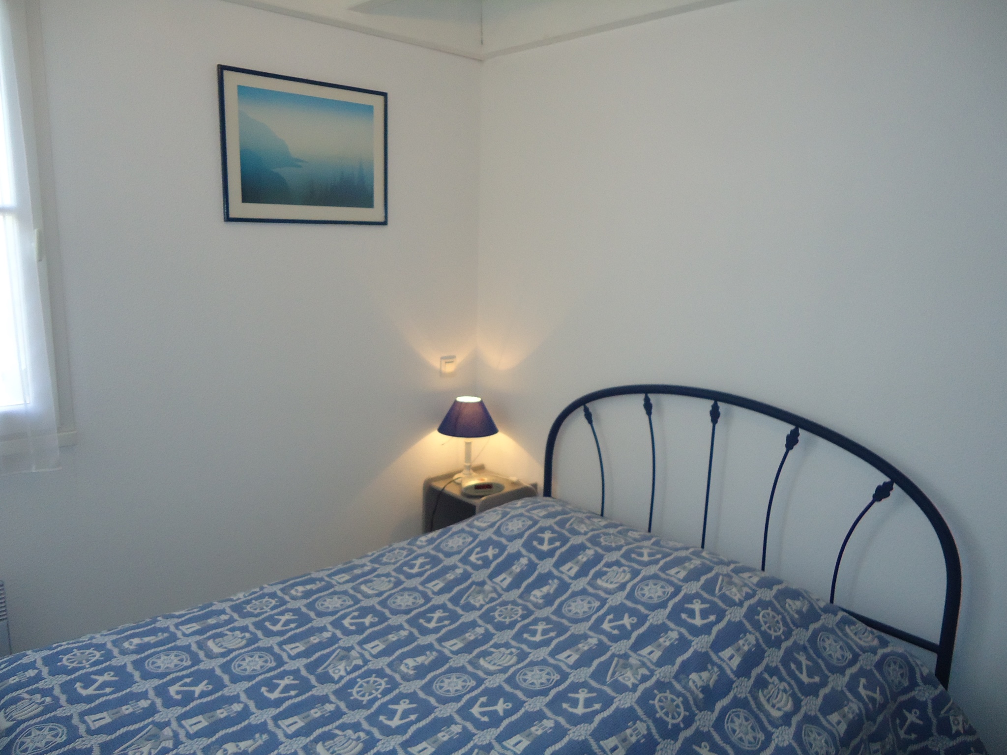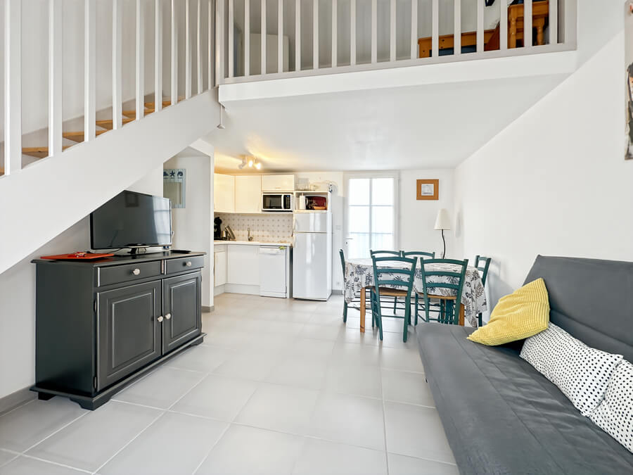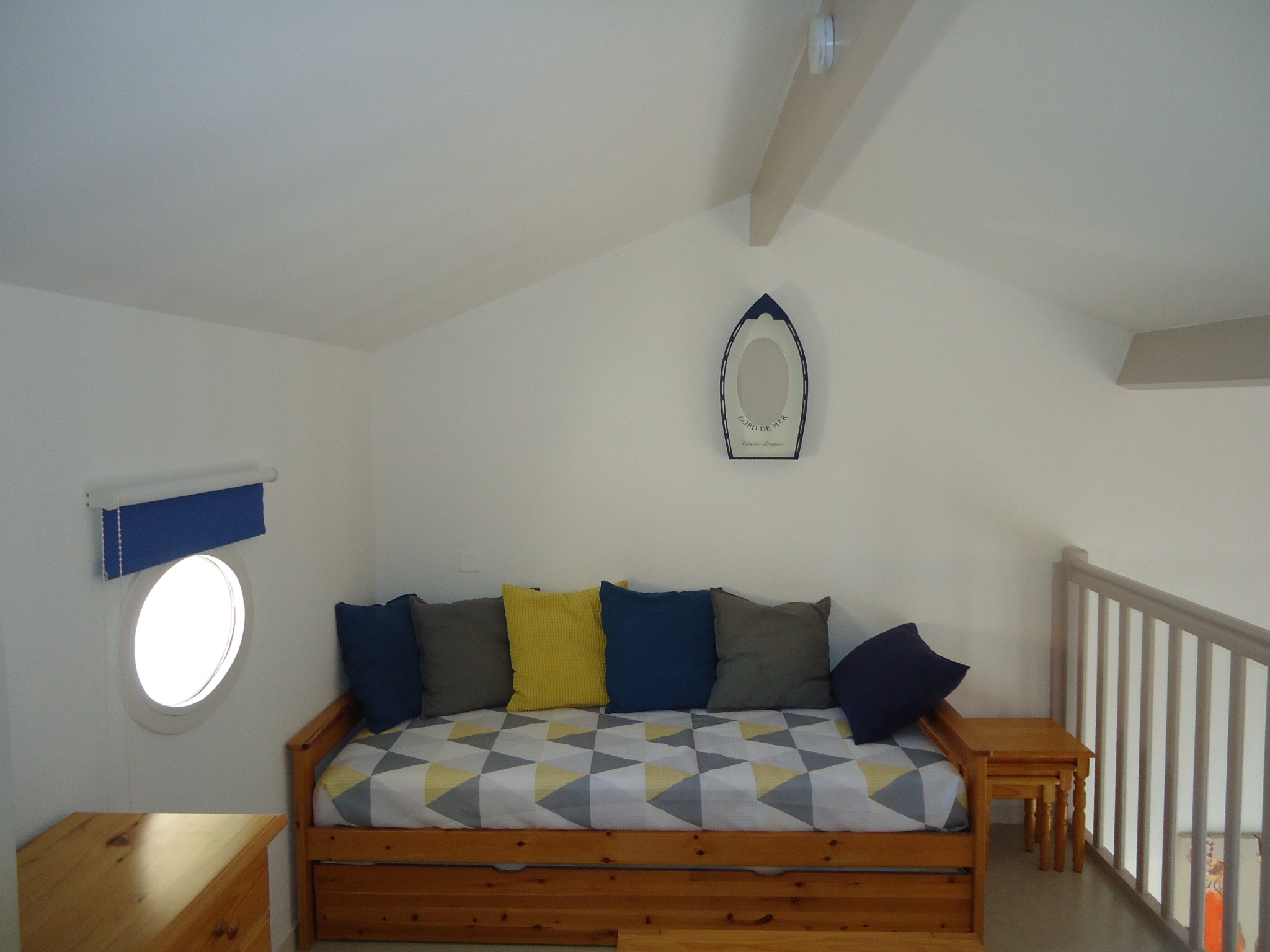 Cette location de vacances se compose d'un séjour avec kitchenette, d'une chambre au rez-de-chaussée avec un lit double (lit de 140), d'une mezzanine avec un lit simple (lit de 80) accompagné d'un lit tiroir (lit de 80), d'une seconde chambre à l'étage avec un lit double (lit de 140) et d'une salle d'eau avec WC séparés.
