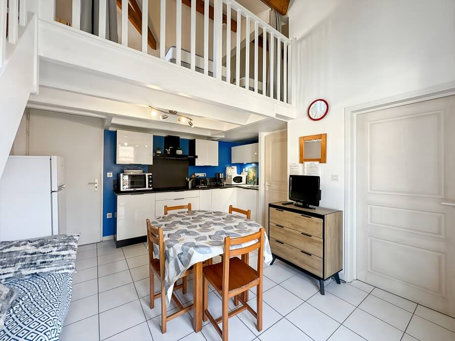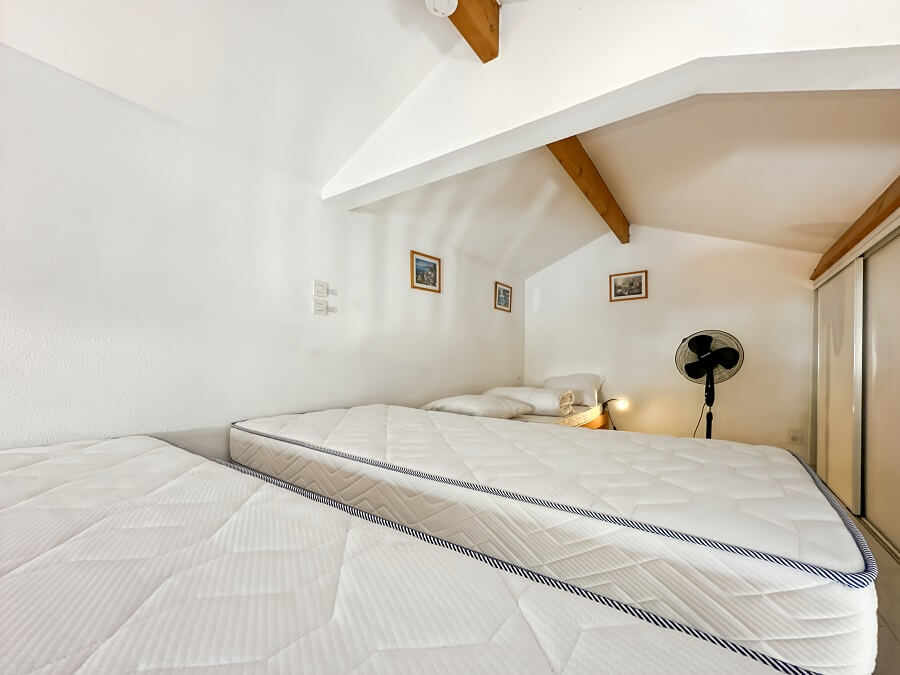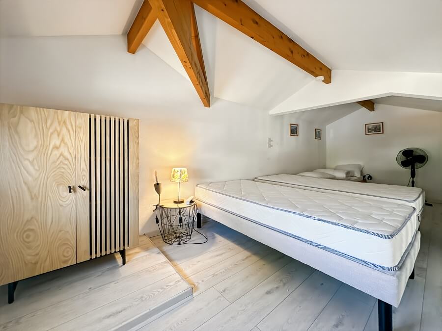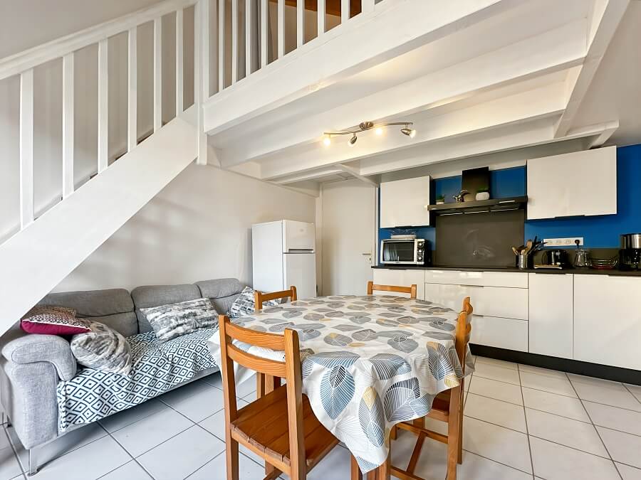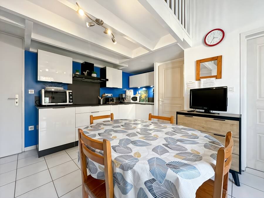 Cette maison de vacances se compose d'un séjour avec une cuisine récente équipée, d'une chambre parentale au rez-de-chaussée (lit 140), d'une mezzanine avec trois lits simples (deux lits de 90 et un de 80) et d'une salle de bain avec WC séparés. Vous pourrez bénéficier d'une cour fermée avec sa belle terrasse et son salon de jardin.