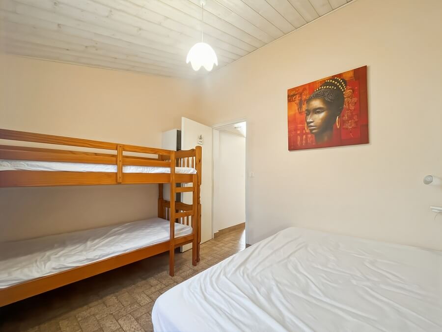 Vous retrouverez dans la première chambre un lit double de 140cm. La seconde chambre est équipée d'un lit double de 140cm et de deux lits simples superposés.
