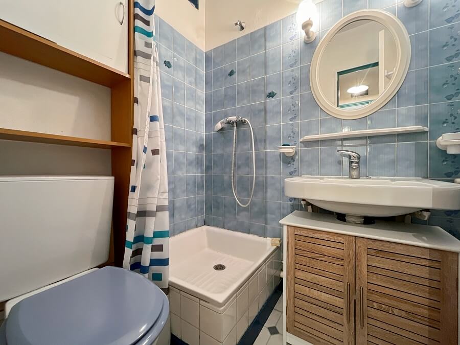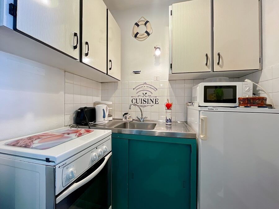 Cette location de vacances avec balcon face mer se compose d'un séjour avec un clic clac, d'une cuisine séparée et d'une salle d'eau avec WC.
