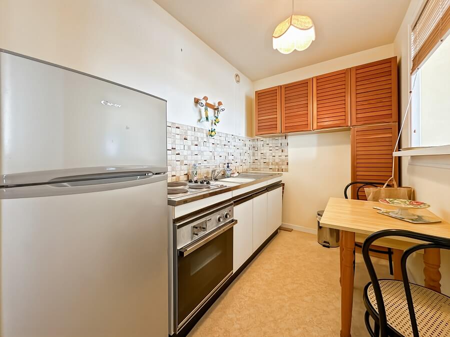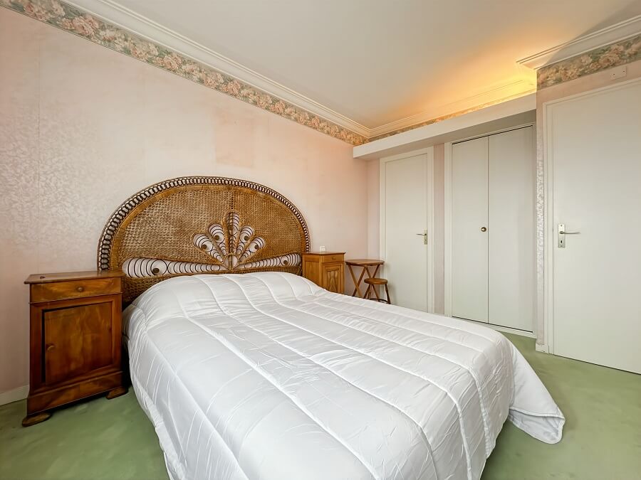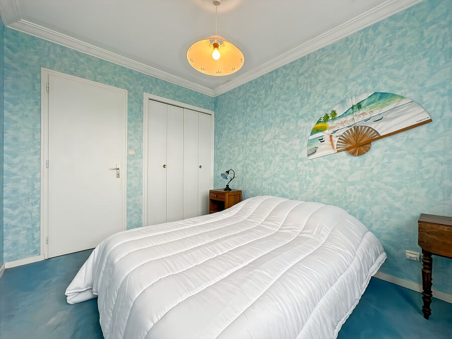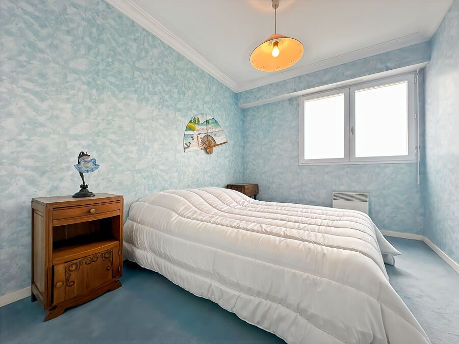 Cet appartement de vacances se compose d'une entrée avec placard, d'une chambre parentale (lit 140cm) avec une salle de bain, d'une seconde chambre avec un lit de 140cm, d'une cuisine donnant sur le séjour, d'un balcon face à la mer et d'une salle d'eau avec WC.