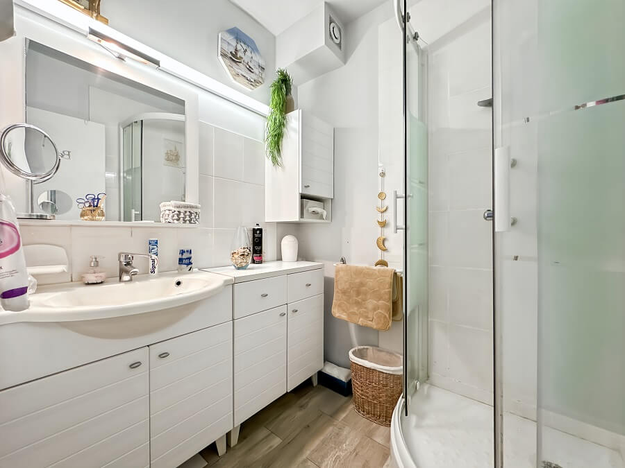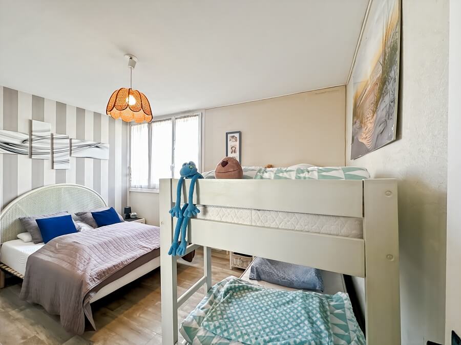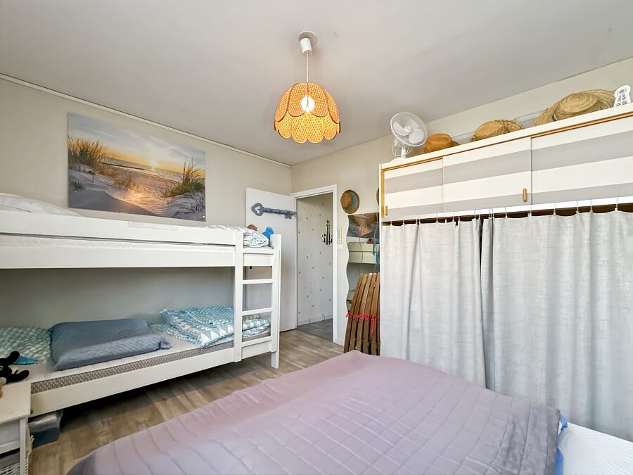 Cet appartement au rez de chaussé se compose d'un salon/cuisine donnant sur une belle terrasse, d'une chambre avec un lit double (lit de 140) et deux lits superposés, d'une salle d'eau avec WC séparés.