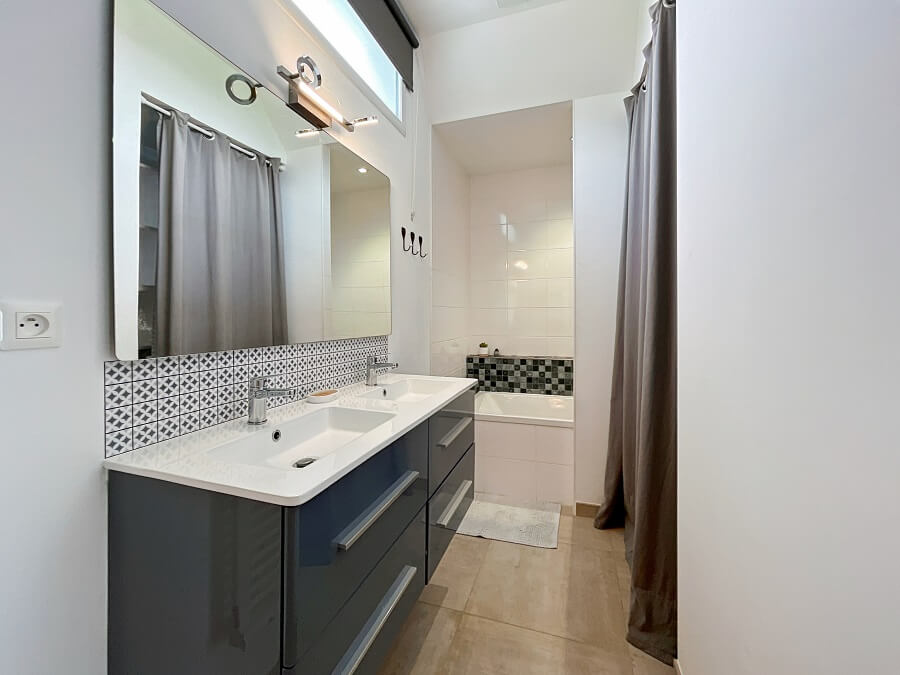 Cette location de vacances se compose d'une grande pièce de vie avec une cuisine ouverte entièrement équipée, d'une salle d'eau avec WC, d'une première chambre avec un lit double (lit de 140) et d'une salle de bain privative, d'une seconde chambre avec un lit double (lit de 140) et d'un grand jardin.