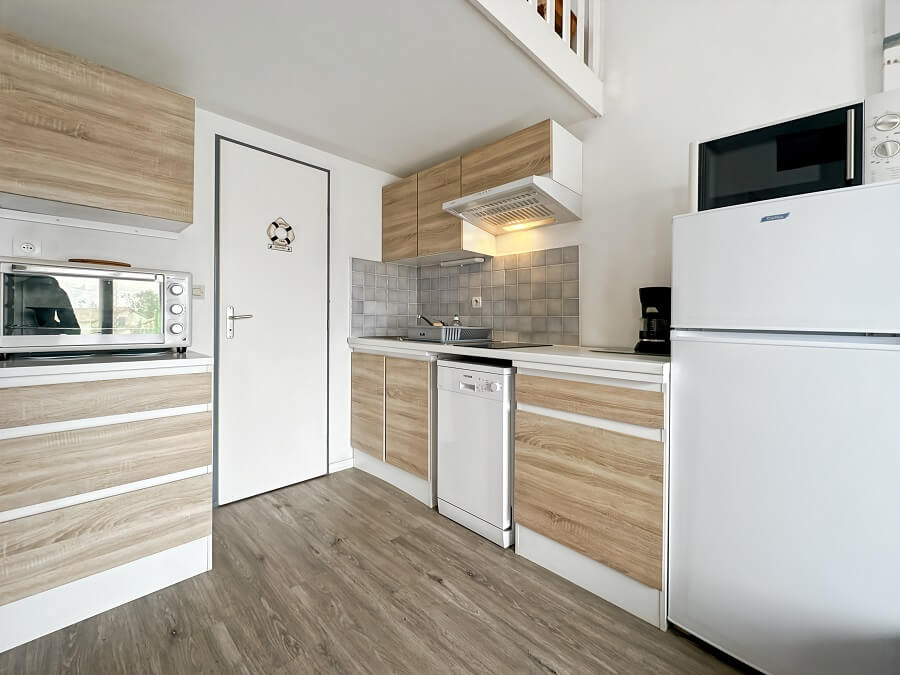 Cette location de vacances se compose d'un séjour avec une cuisine toute équipée, d'une chambre au rez-de-chaussée, d'une mezzanine, d'une salle d'eau avec WC et d'une grande terrasse sur laquelle vous pourrez manger ou vous reposer.
