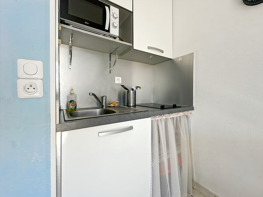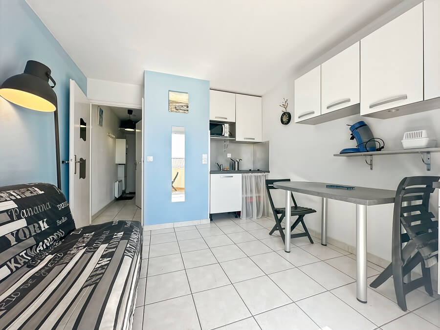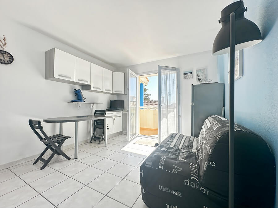 Ce logement est situé au premier étage d'une résidence sans ascenseur. L'appartement se compose d'une pièce de vie avec un séjour et une cuisine, d'une chambre, d'une salle de bain avec WC et d'un balcon avec aperçu mer.