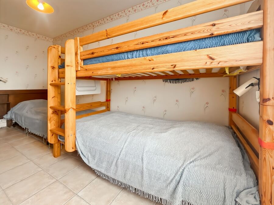 Vous retrouverez dans la première chambre un lit double de 140cm. La seconde chambre dispose de deux lits simples superposés de 90cm et d'un lit simple de 80cm.