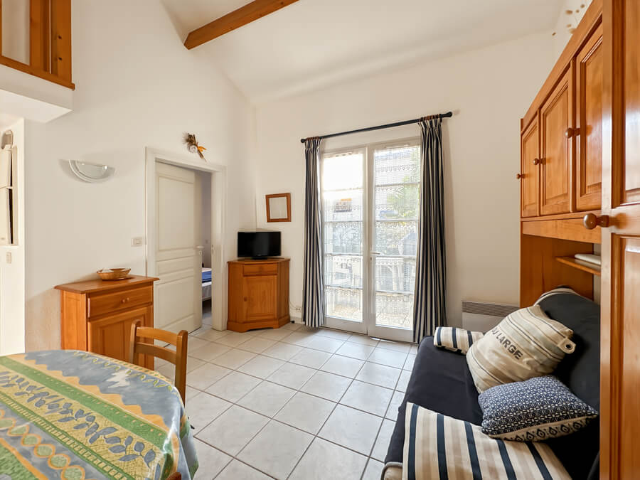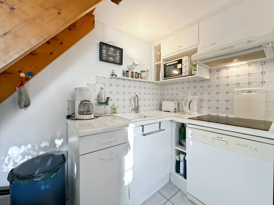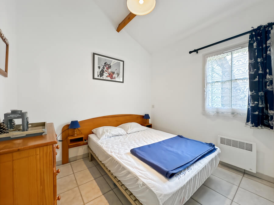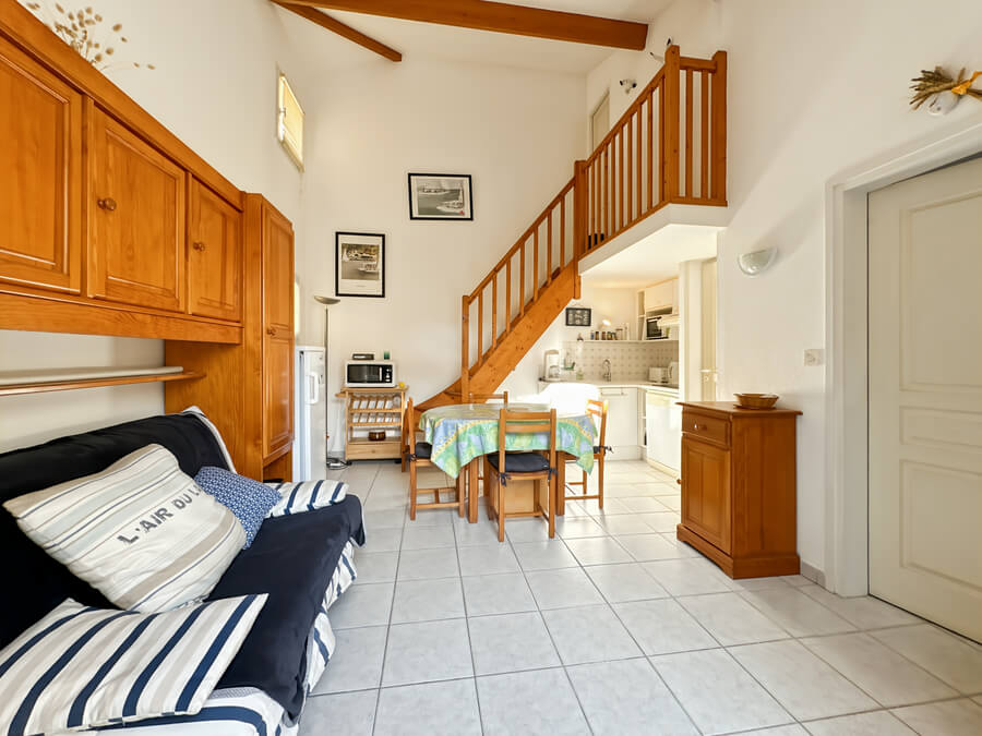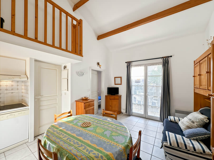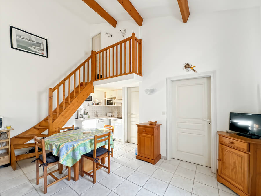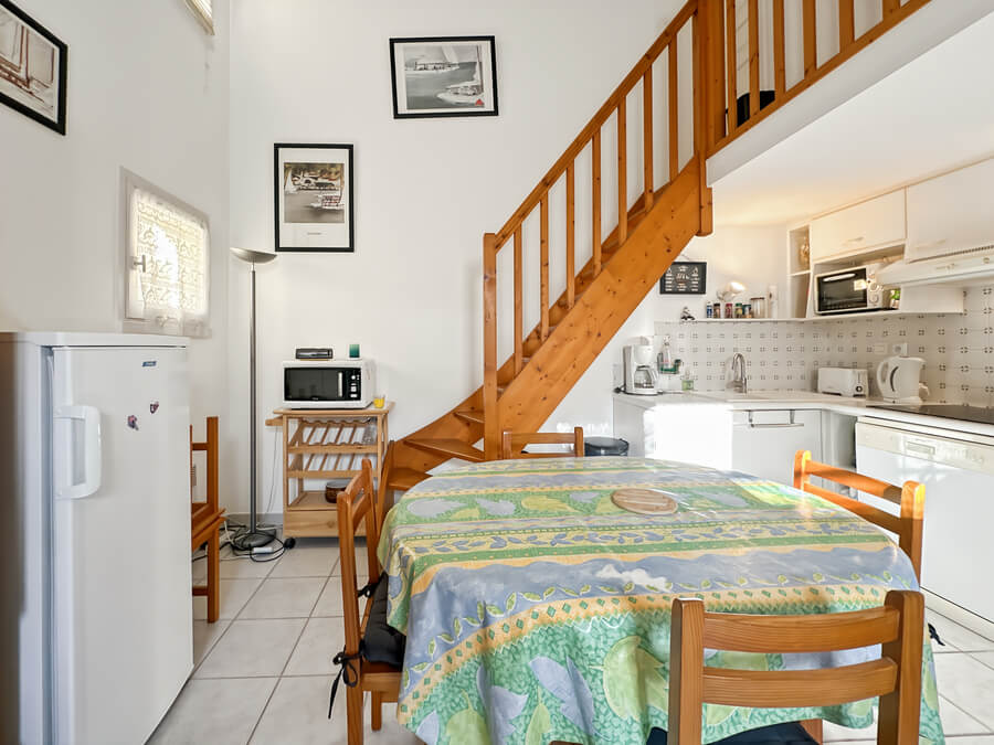 Cette maison de vacances se compose d'un séjour avec kitchenette, d'une chambre parentale au rez-de-chaussée (lit de 140), d'une mezzanine avec deux lits (lits de 90), d'une salle de bain et de WC séparés.