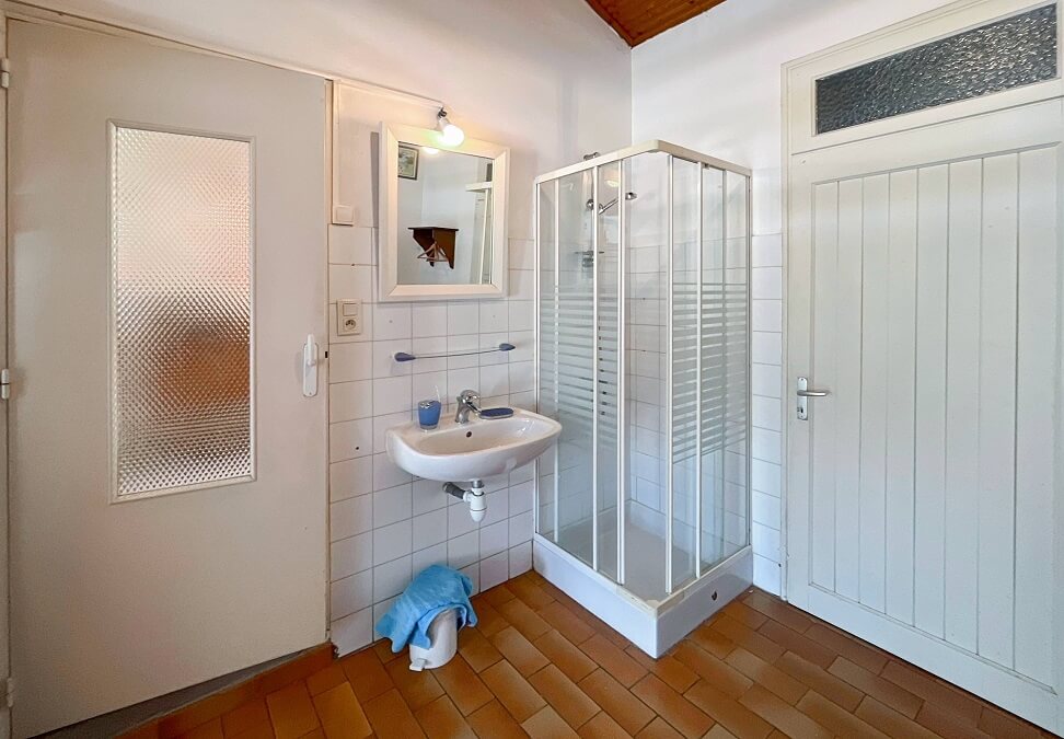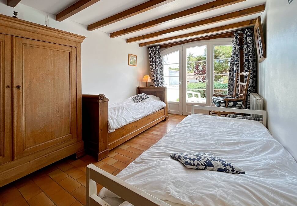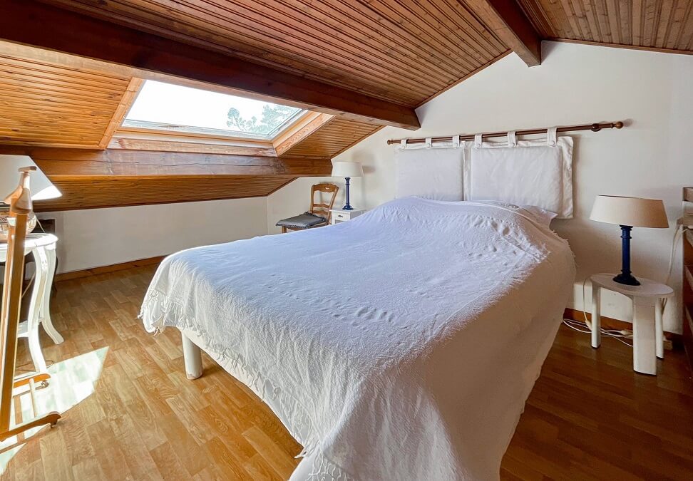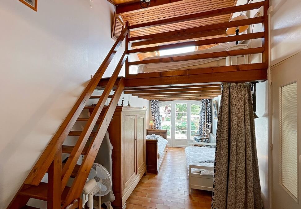 la maison dispose de deux chambres : une première avec un lit double (140cm) et une deuxième avec deux lits simples (90cm) et un lit double (140 cm) dans la mezzanine. cette deuxième chambre dispose d'une douche.