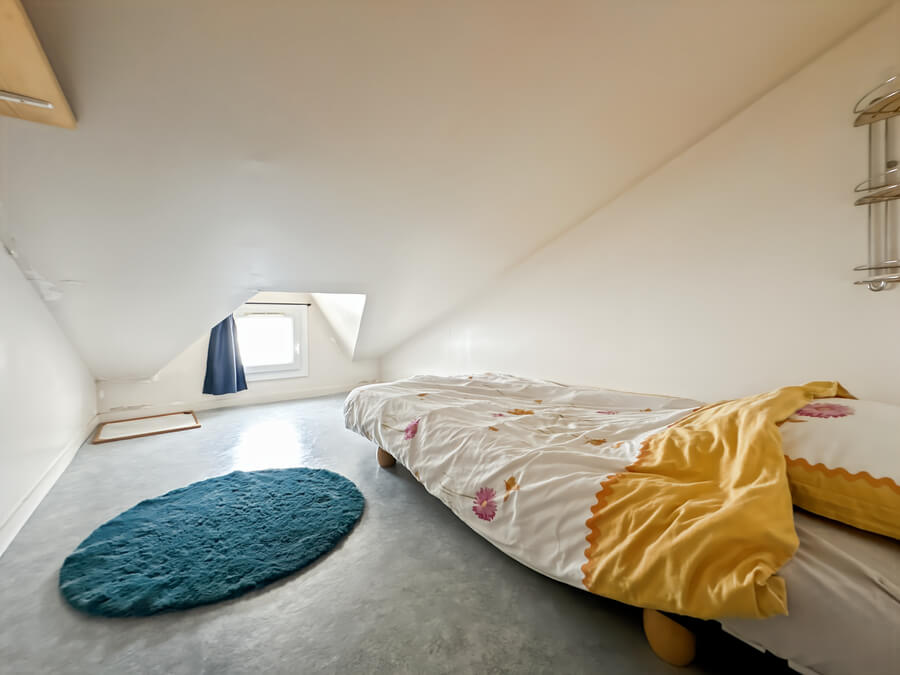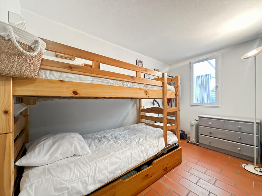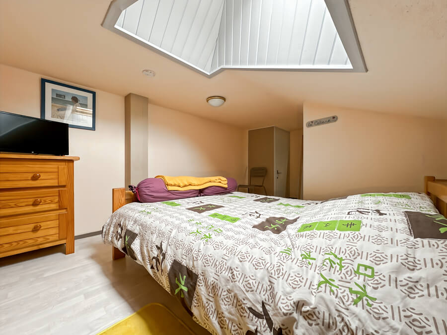 Vous trouverez dans la chambre au rez de chaussé un deux lits simples superposés et dans la mezzanine un lit simple et un lit de 140cm (escalier très pentu - ce couchage ne convient pas aux enfants de moins de 6 ans pour des raisons de sécurité).