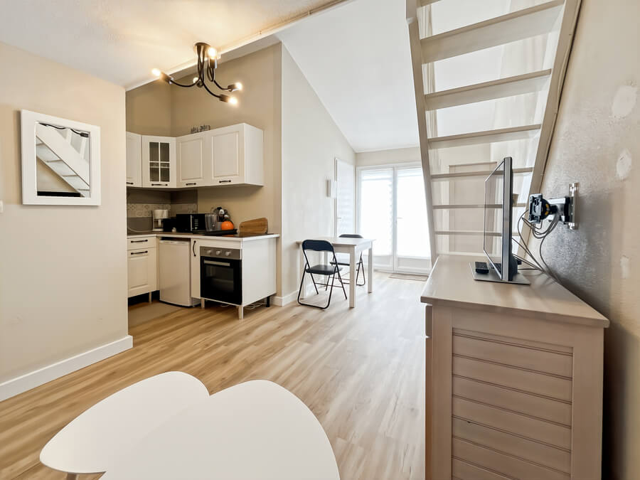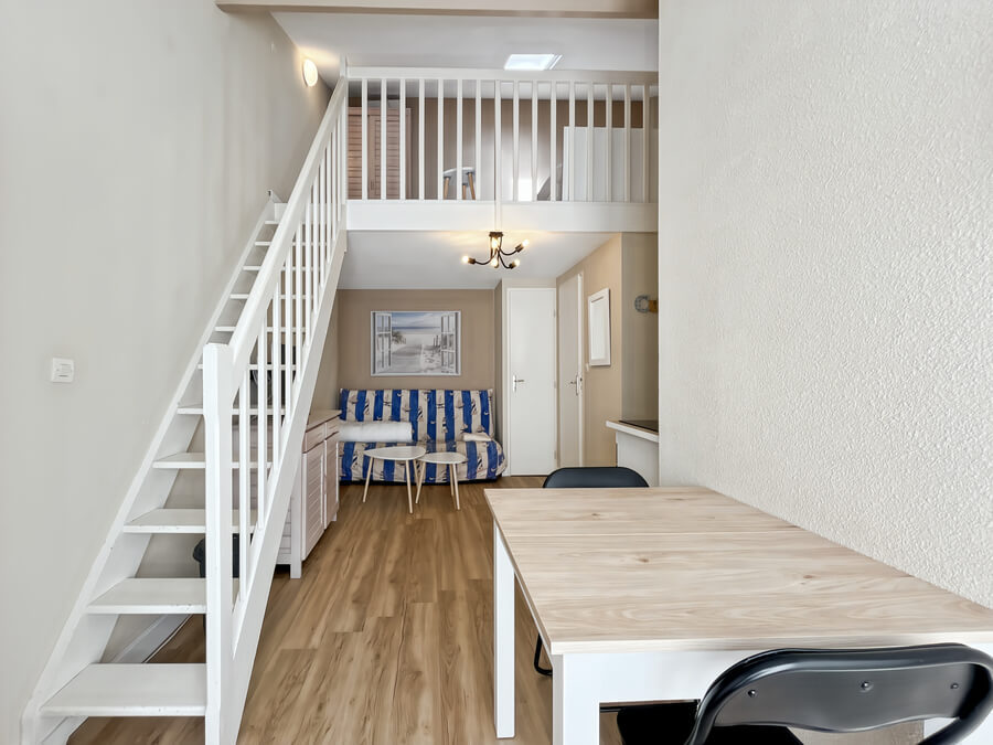 Cette location de vacances se compose d'un séjour avec une cuisine toute équipée, d'une chambre au rez-de-chaussée, d'une mezzanine, d'une salle de bain avec WC séparés et d'une cour fermée pour manger ou vous reposer.