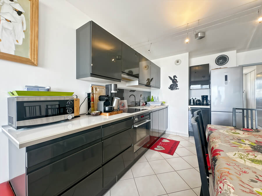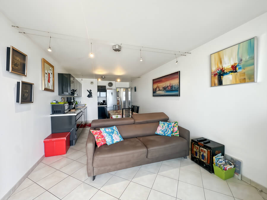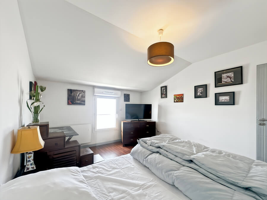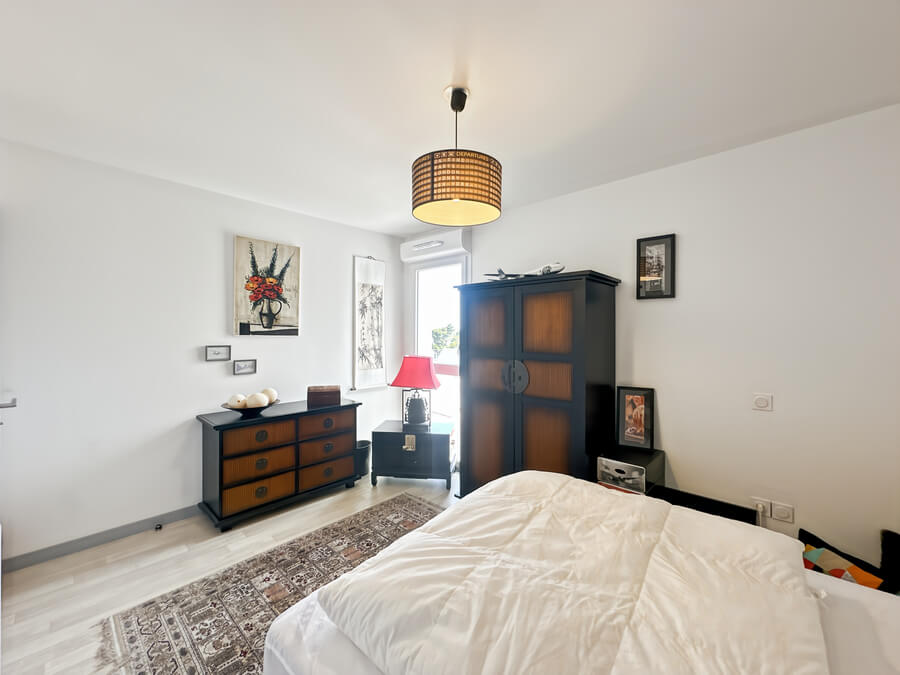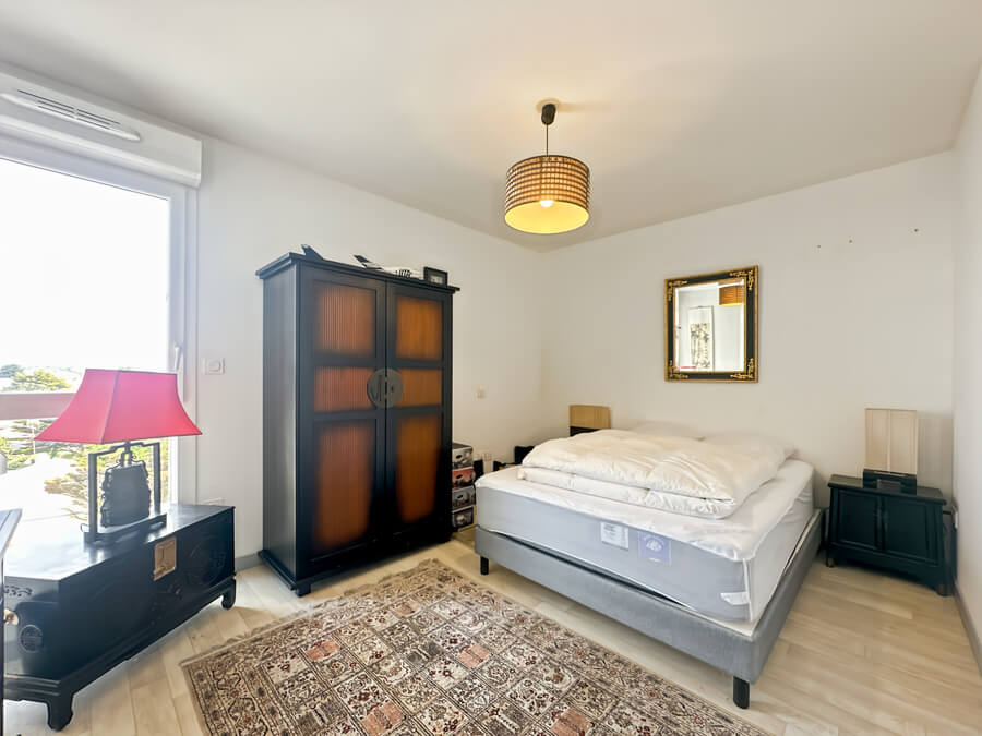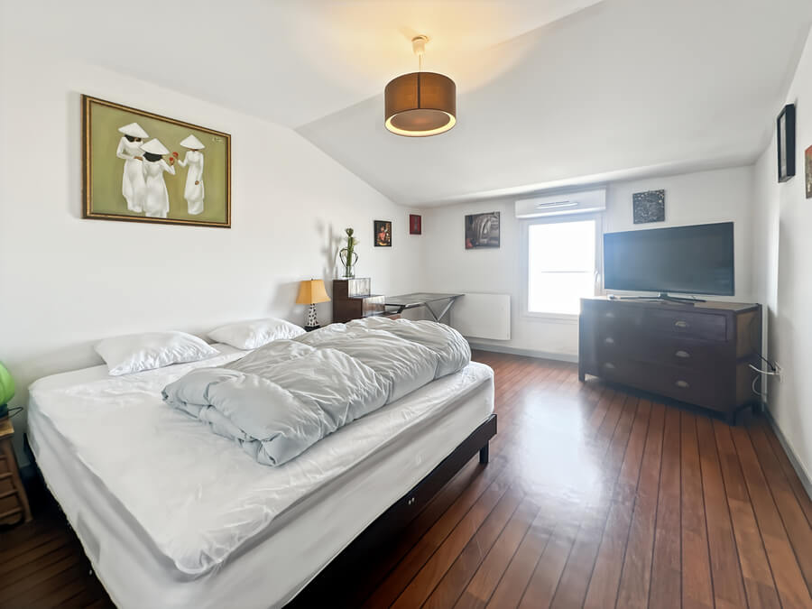 À l’étage, l’appartement dispose d’une chambre avec vue sur la mer, d’un dressing et d’une salle d’eau avec WC.